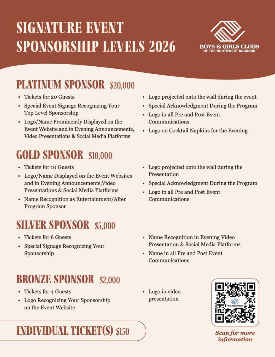 Join us for a memorable evening celebrating the Palatine Community Board of Boys & Girls Clubs of the Northwest Suburbs and their dedication to the Palatine community. Learn about the impact we’re making in the lives of local youth and how you can be part of the future.