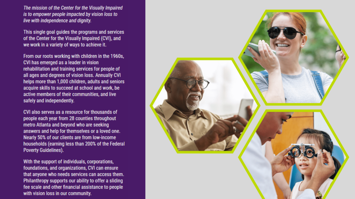 Night Visions is the Center for the Visually Impaired’s signature gala, bringing together community leaders, donors, and friends to celebrate the progress made possible through compassion and support. The evening highlights the transformative impact of CVI’s work, helping people with vision loss gain the skills, confidence, and independence to thrive.