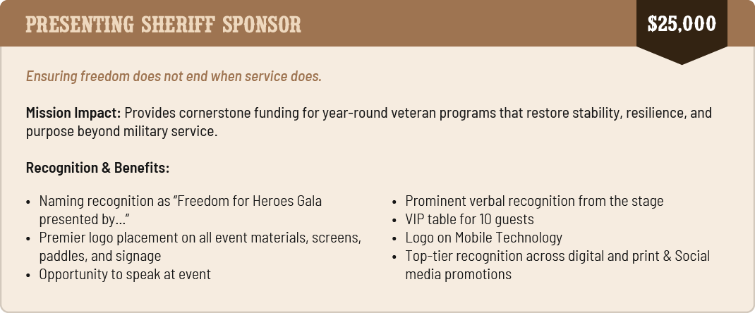 Freedom for Heroes exists to honor, support, and restore the freedom of our nation’s veterans by providing critical resources, community, and hope beyond their service. Your sponsorship directly fuels programs that help veterans reclaim independence, dignity, and opportunity after the uniform comes off.