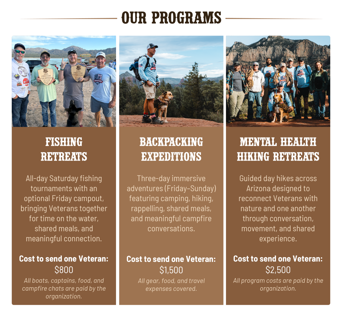 Freedom for Heroes empowers veterans to heal and reconnect through no-cost outdoor adventures, mental health resources, and claims guidance. A veteran-led designated 501(c)3 organization, we are committed to exceptional financial stewardship.