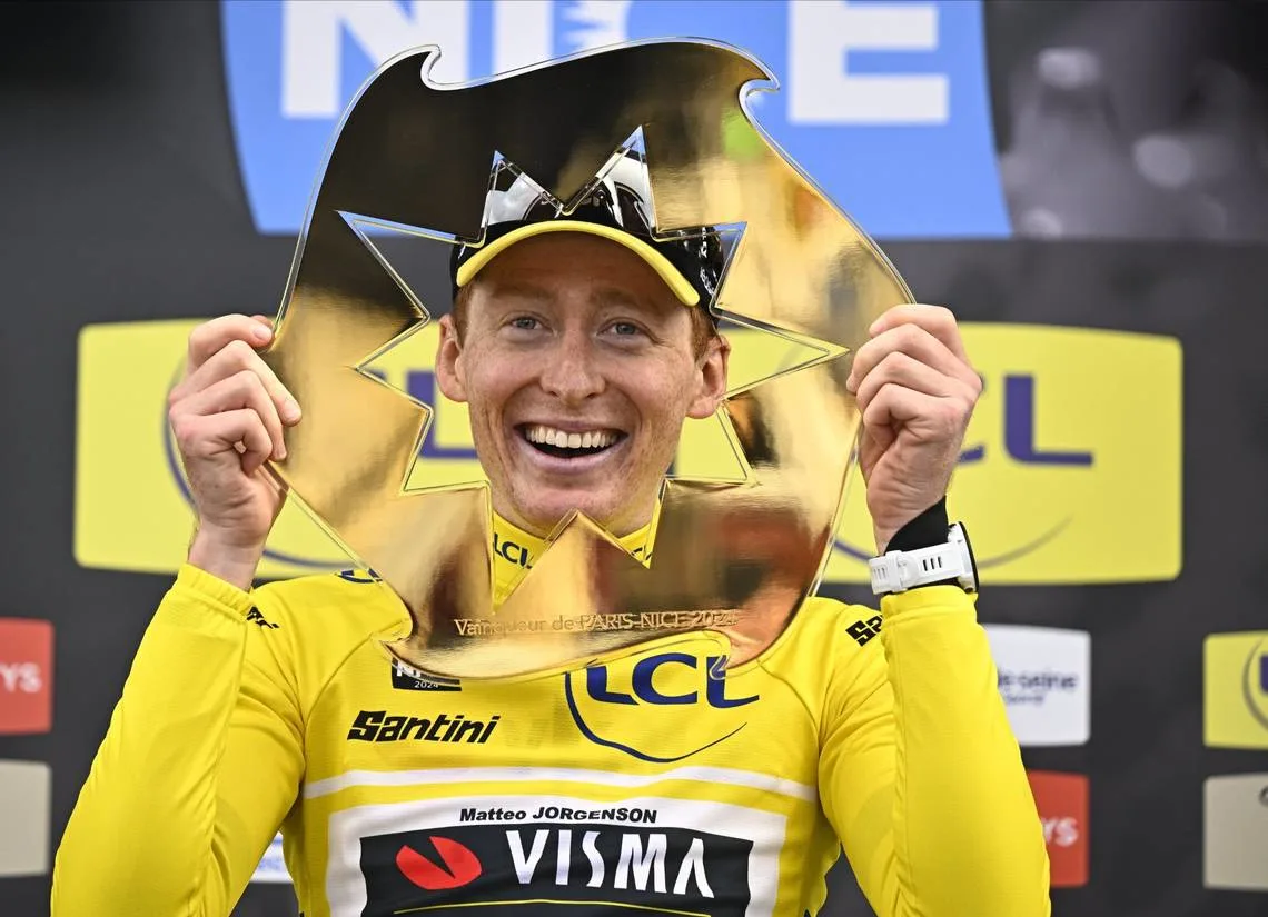 ^Matteo, after winning the eight-day Paris-Nice stage race in March. “Until this year, I never would have thought this was possible, but here we are,” Jorgenson told Bicycling.com after Paris-Nice. “It couldn’t have gone any better today and the whole week. I could barely sleep last night. I was so nervous. For the first time, I felt the pressure. To win and to ride with a champion like (Belgian cyclist) Remco (Evenepoel) is a special moment.”